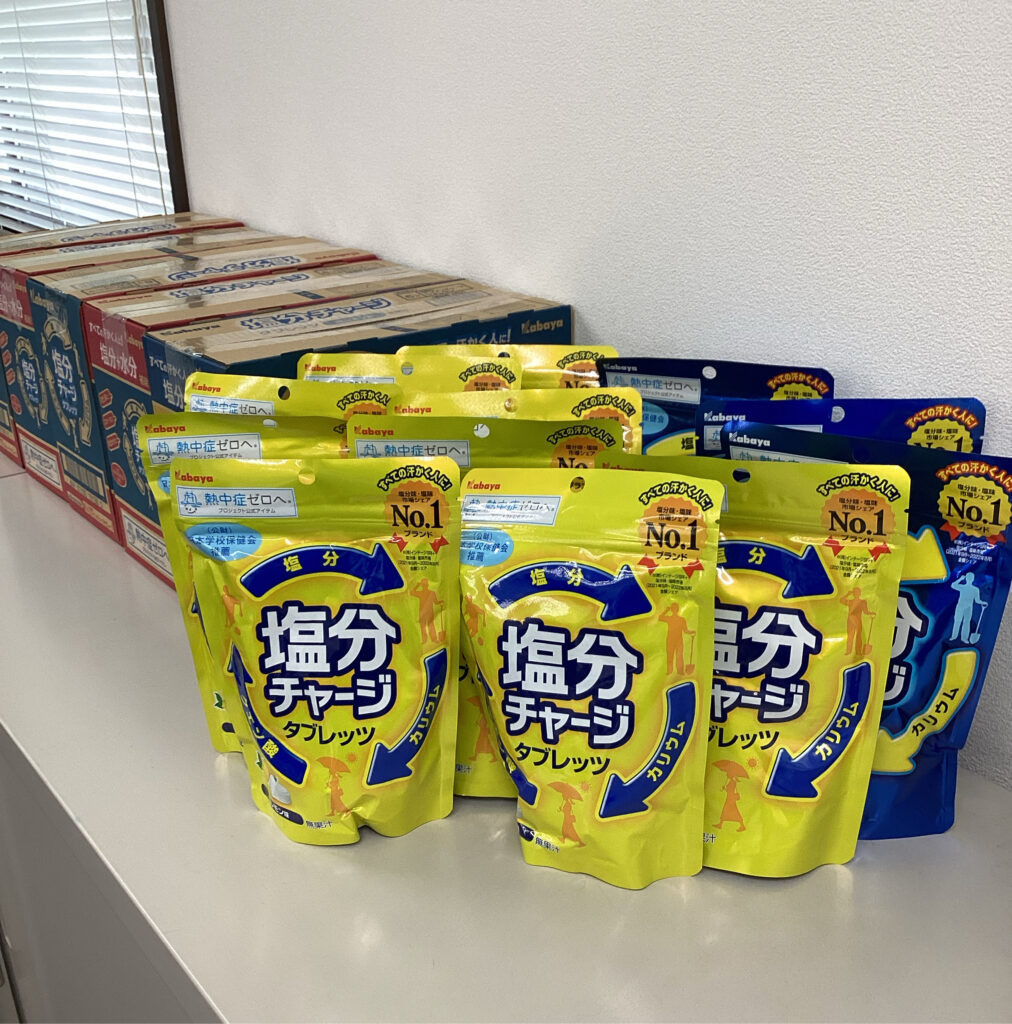 早くも暑い日々が続いているため、熱中症予防のための塩分タブレット支給を行いました。