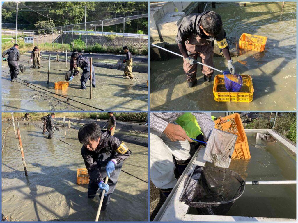 東洋プラントは養魚場で稚魚を捕獲するところから放流までのお手伝いをさせていただきました。