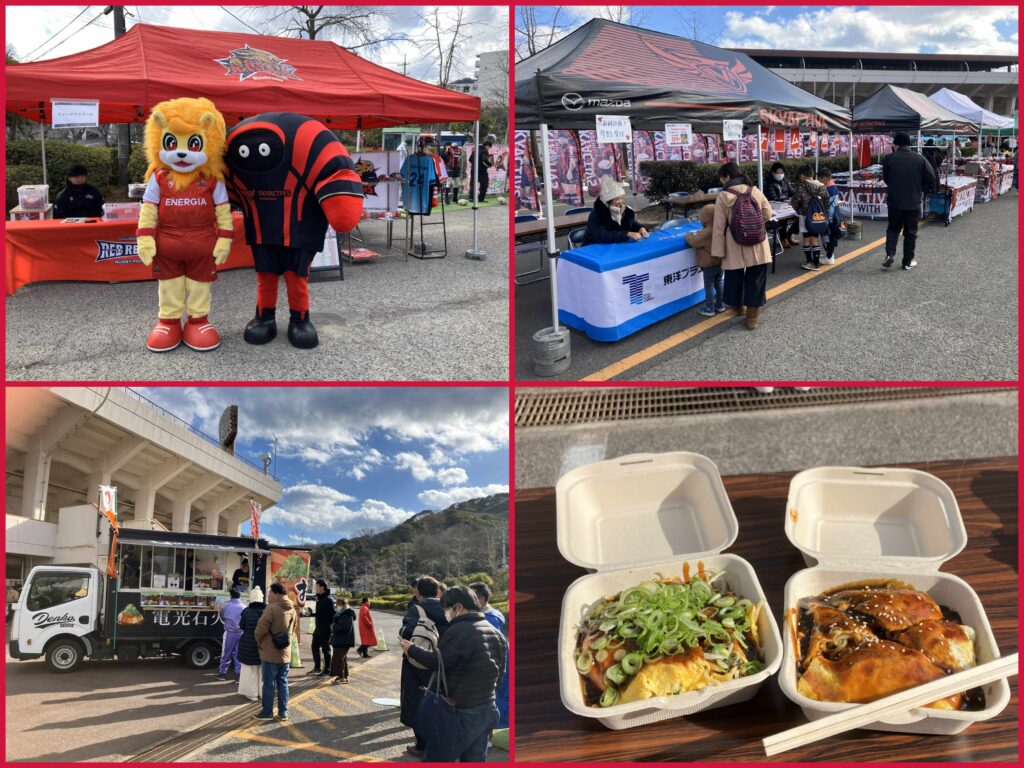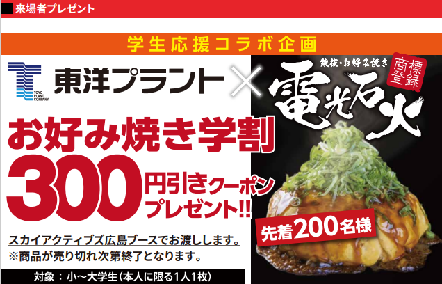今回はパートナー企業になってから初めての福山会場での試合ということで、東洋プラントはお好み焼きの電光石火様とコラボさせていただき、学生応援企画を実施しました!